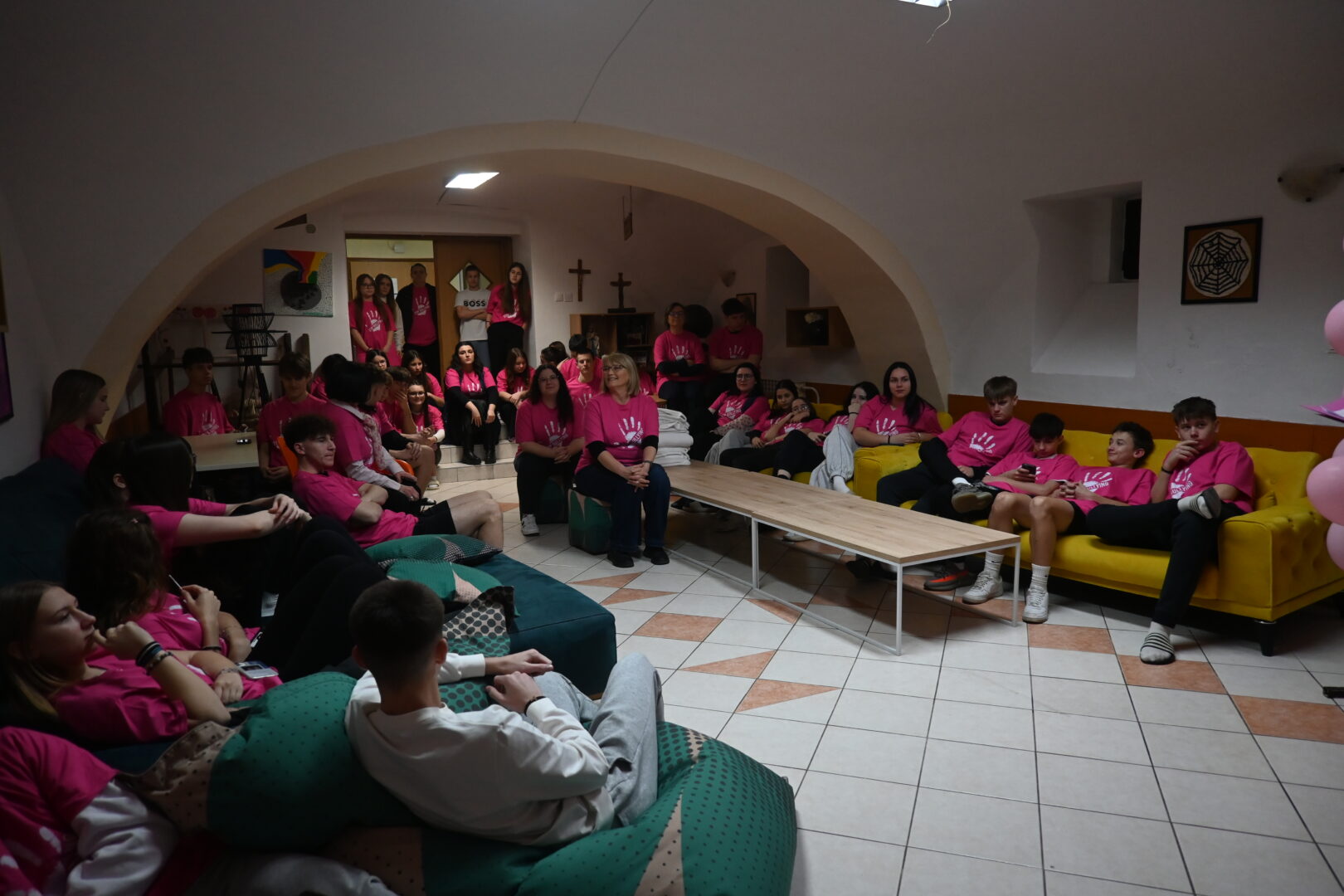 —–ukrašavanje prostora dnevnog boravka ružičastim balonima i majicama od hamer papira-KREATIVNA RADIONICA IZRADE MAJICA I UKRAŠAVANJA PROSTORA